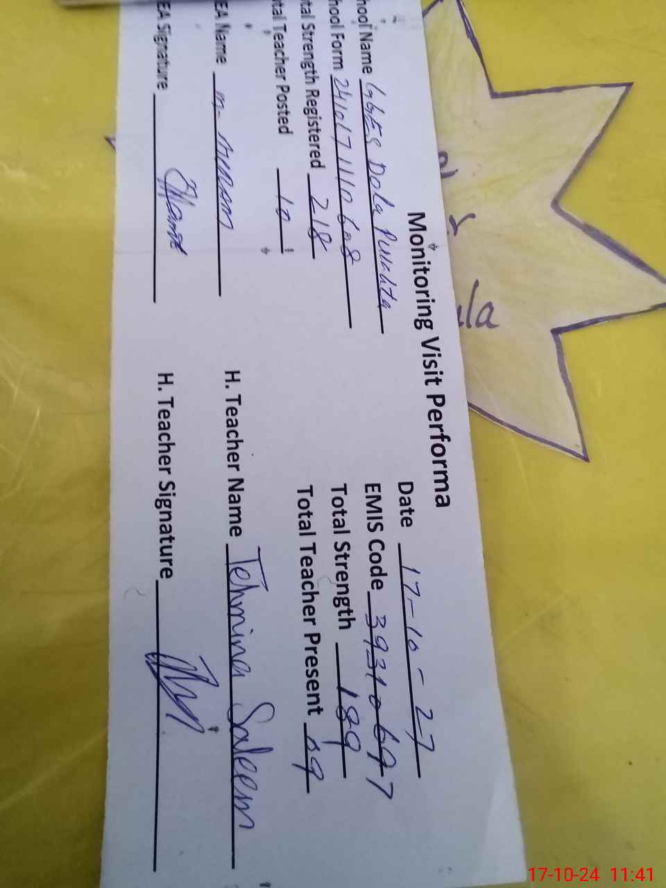 | Attendance Register | Head Teacher | MEA with School | Visit Proof |