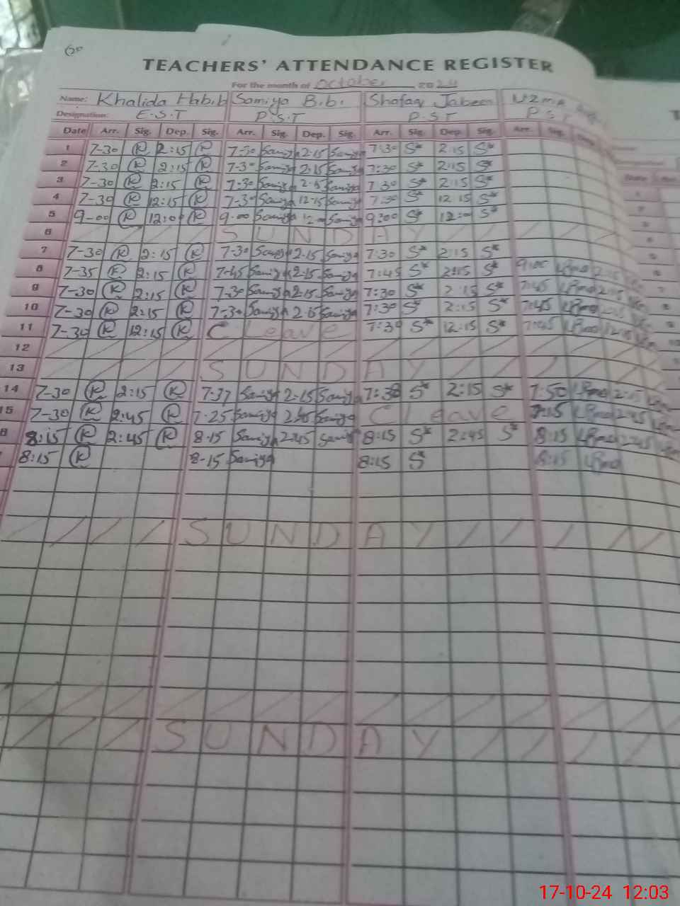 | CNIC | Full Name | Designation | R/C | Absence During Last Calender Month |