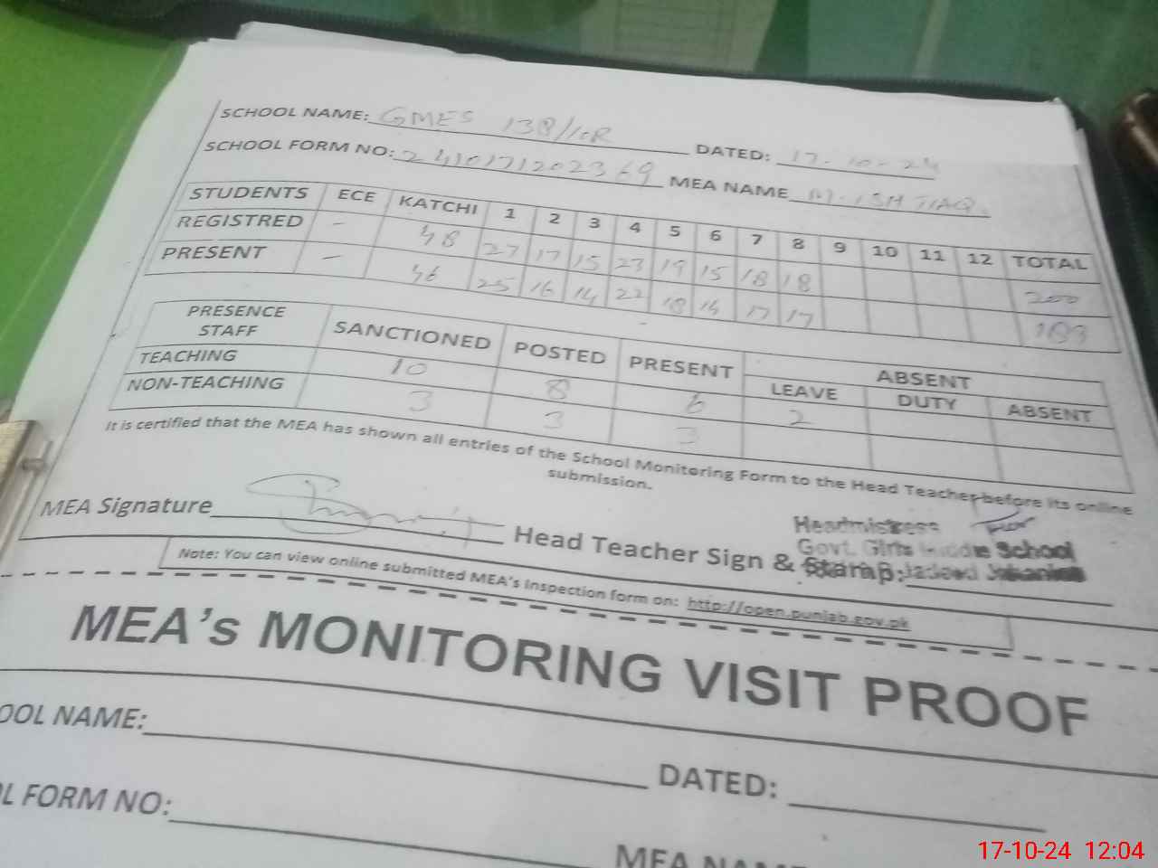 | Attendance Register | Head Teacher | MEA with School | Visit Proof |