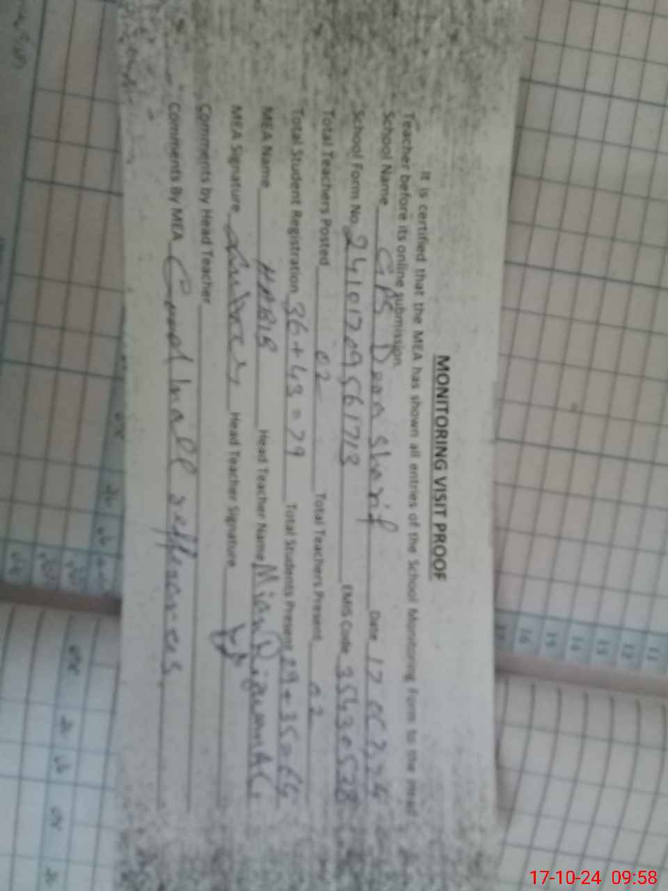 | Attendance Register | Head Teacher | MEA with School | Visit Proof |