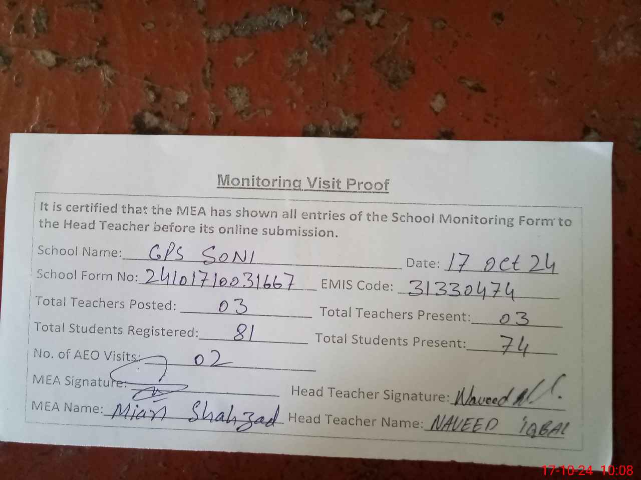 | Attendance Register | Head Teacher | MEA with School | Visit Proof |