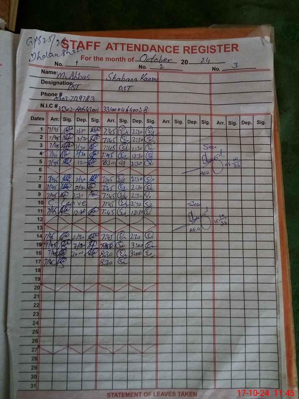 | CNIC | Full Name | Designation | R/C | Absence during last cal. month |