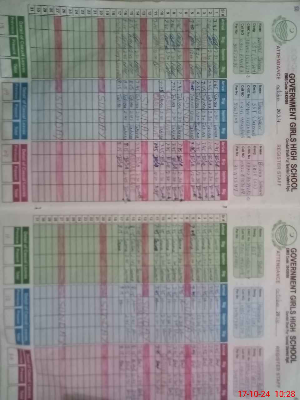 | CNIC | Full Name | Designation | R/C | Absence During Last Calender Month |