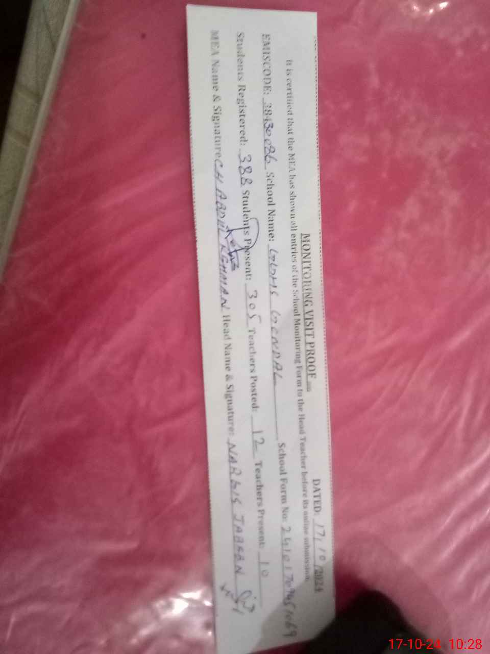 | Certified that this School was Inspected by the Undersigned MEA/DMO Today and the Information Stated Above is as Per Record. | |||||