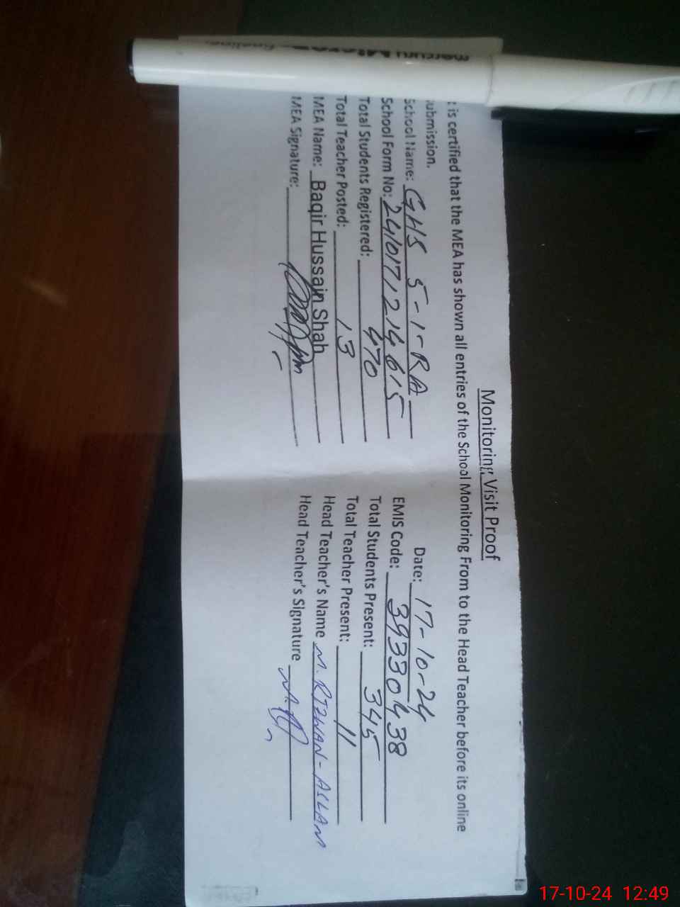 | EMIS Code: 39330438 | Name of School: GHS CHAK NO. 5/1-RA | |||