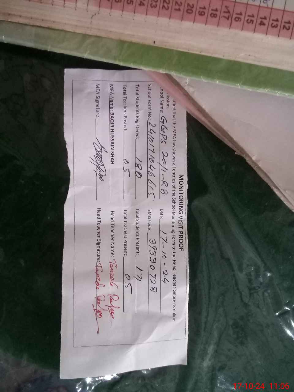 | Attendance Register | Head Teacher | MEA with School | Visit Proof |