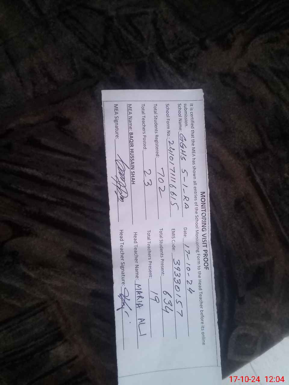 | Attendance Register | Head Teacher | MEA with School | Visit Proof |