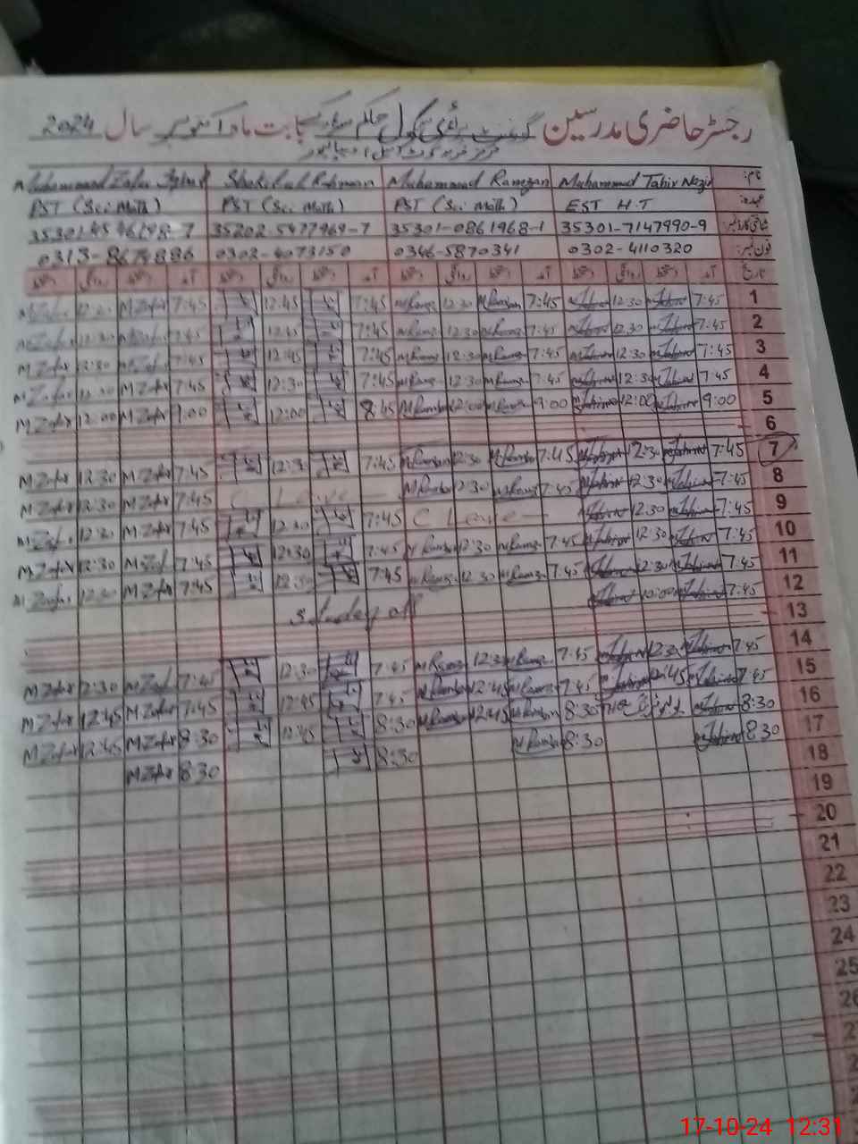 | CNIC | Full Name | Designation | R/C | Absence during last cal. month |