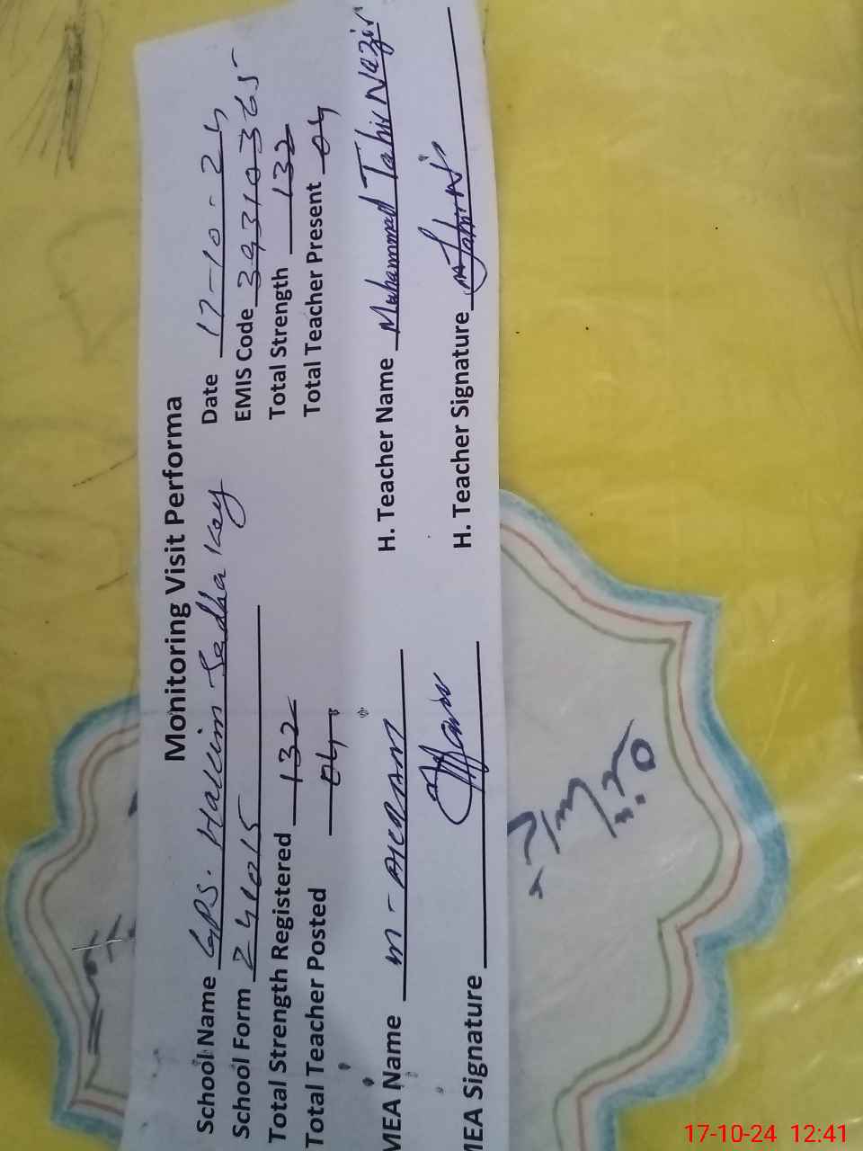 | Attendance Register | Head Teacher | MEA with School | Visit Proof |