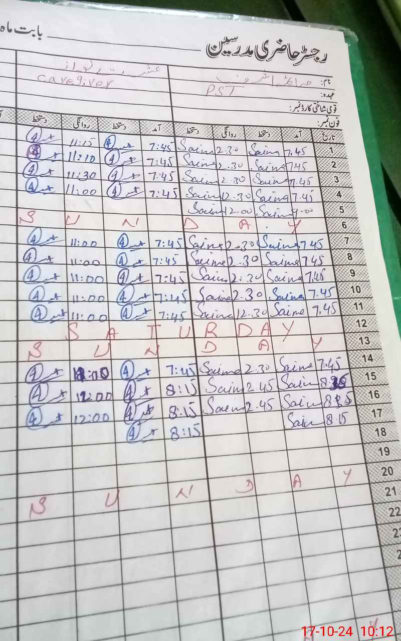 | CNIC | Full Name | Designation | R/C | Absence During Last Calender Month |
