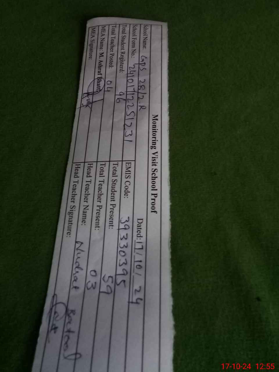 | Attendance Register | Head Teacher | MEA with School | Visit Proof |