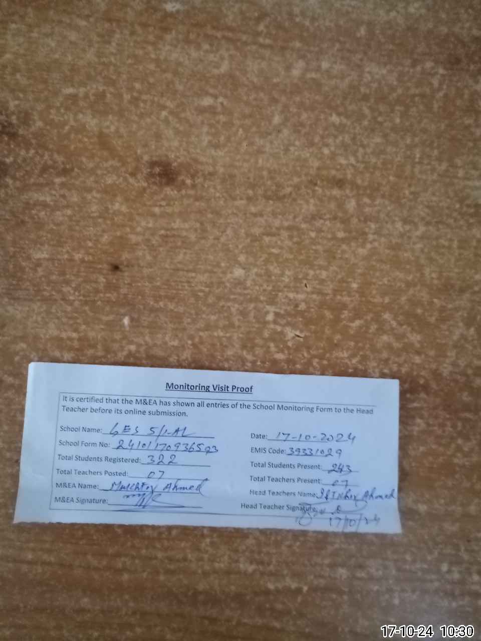 | Name: IF**** AH**** Designation: (School Headmaster's/Headmistress's) SST Phone/Cell Number: 03**** |