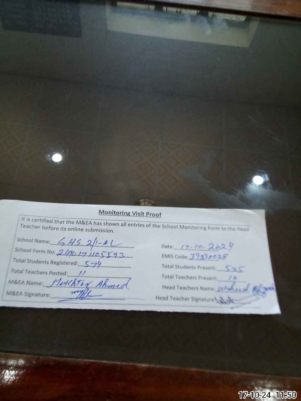 | Attendance Register | Head Teacher | MEA with School | Visit Proof |