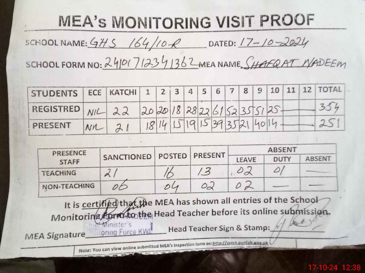 | Certified that this School was Inspected by the Undersigned MEA/DMO Today and the Information Stated Above is as Per Record. | |||||