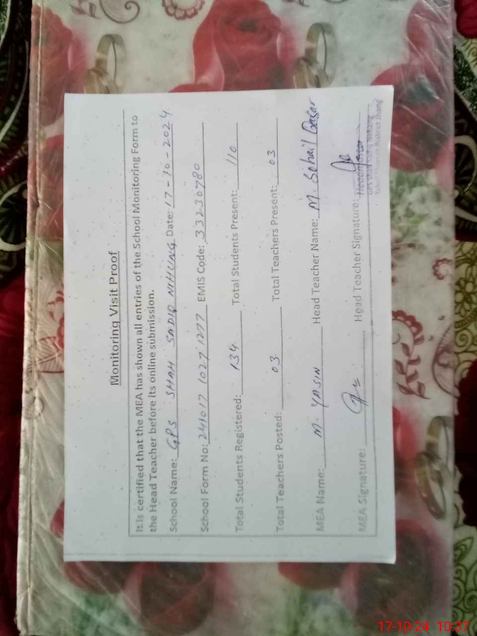 | EMIS Code: 33230780 | Name of School: GPS SHAH SADIQ NIHUNG | |||