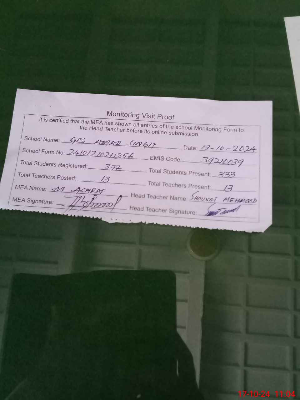 | Attendance Register | Head Teacher | MEA with School | Visit Proof |