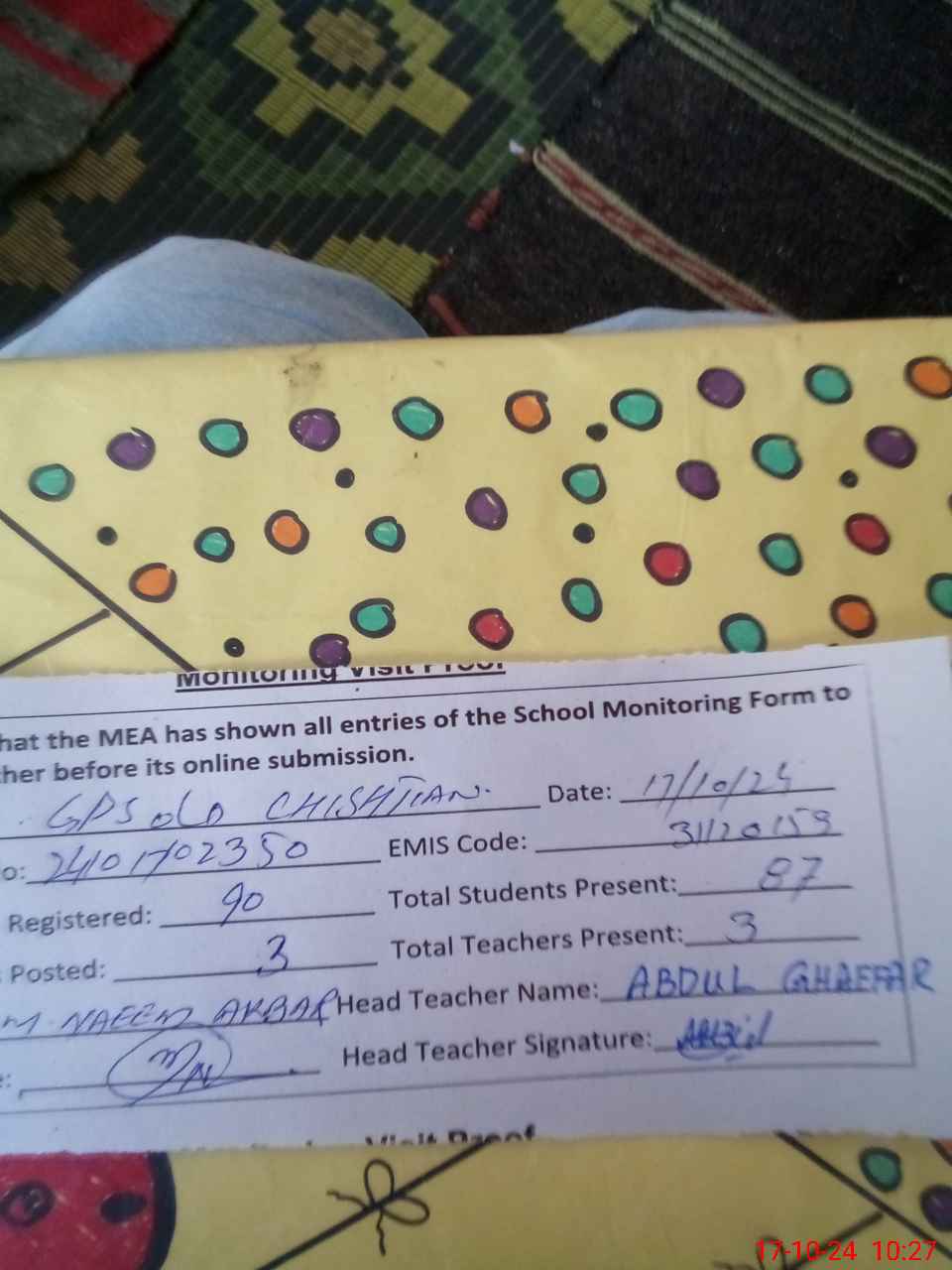 | Name: MAs**** Designation: (School Headmaster's/Headmistress's) PST Phone/Cell Number: 03**** |