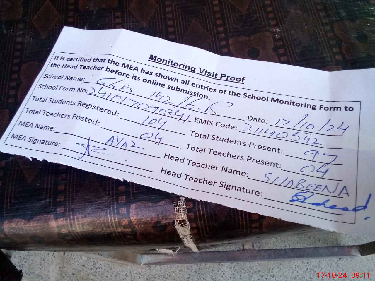 | Attendance Register | Head Teacher | MEA with School | Visit Proof |