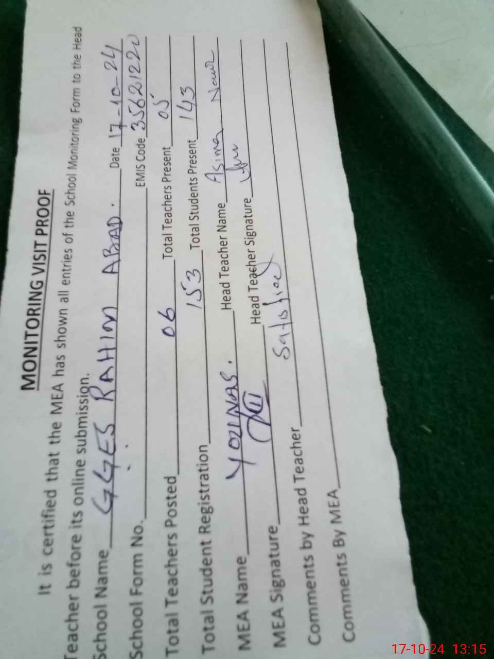 | Attendance Register | Head Teacher | MEA with School | Visit Proof |
