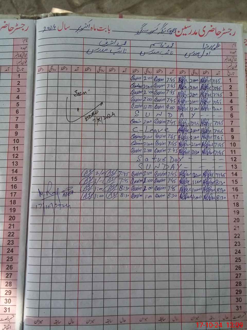 | Name: AL**** RA**** Designation: (School Headmaster's/Headmistress's) PST Phone/Cell Number: 03**** |