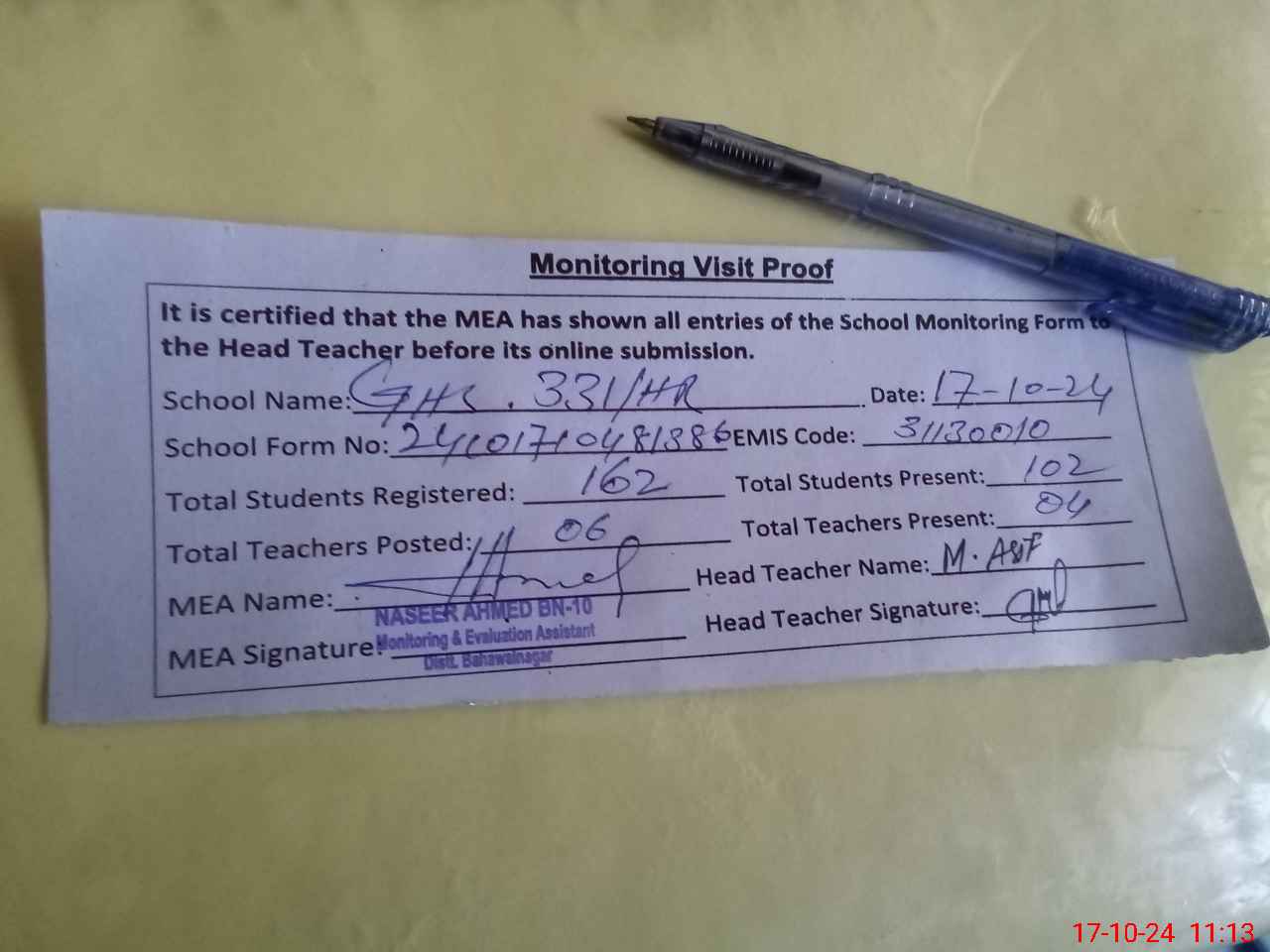 | EMIS Code: 31130010 | Name of School: GHS CHAK 331/HR | |||