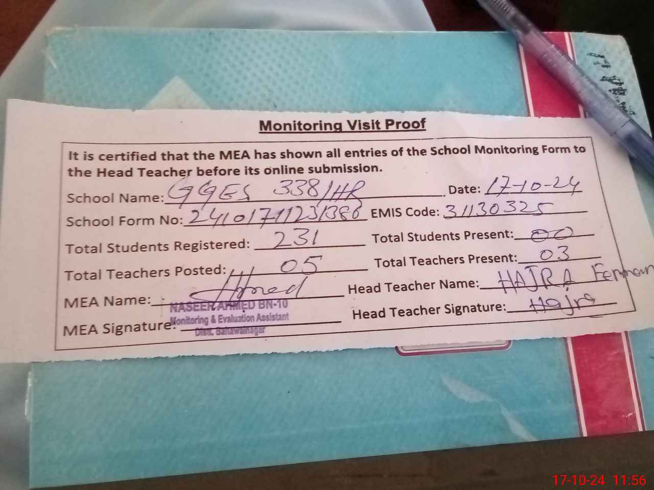 | EMIS Code: 31130325 | Name of School: GGES CHAK NO 338 HR | |||