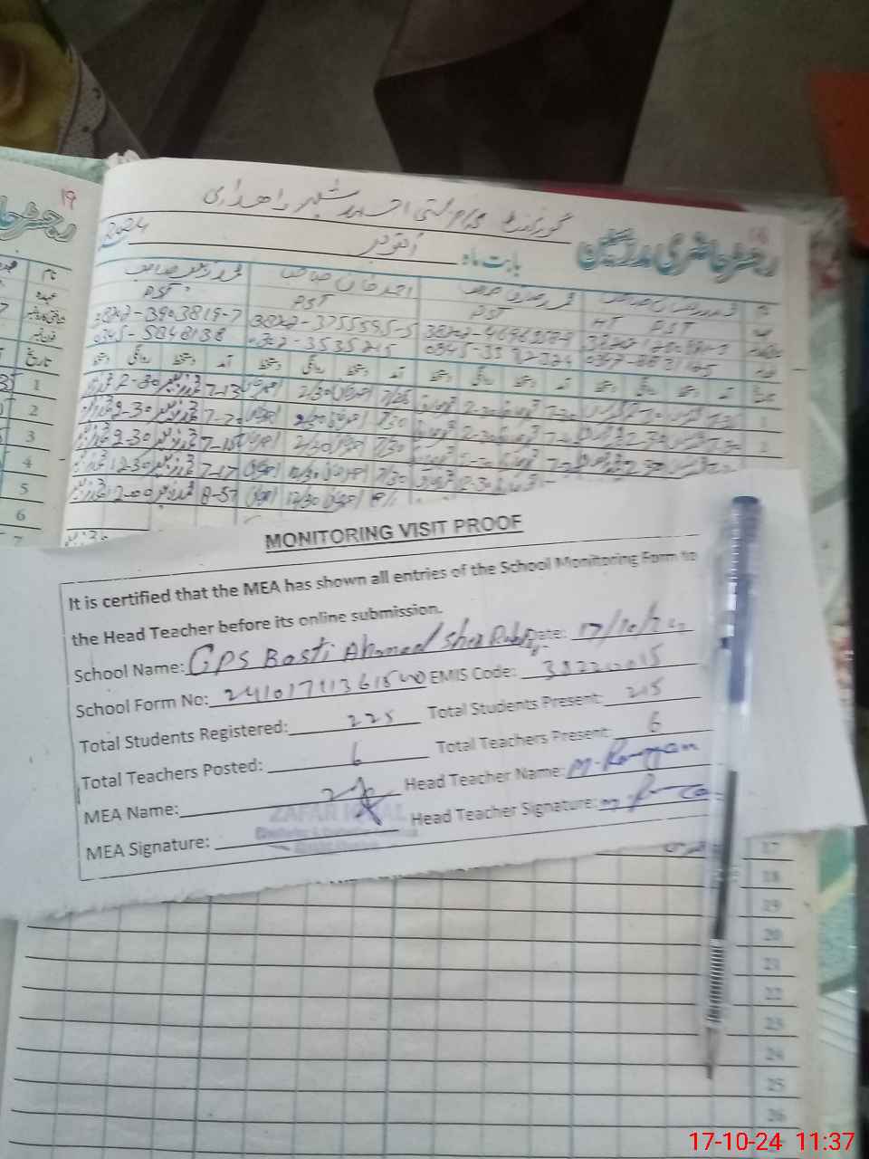 | Attendance Register | Head Teacher | MEA with School | Visit Proof |