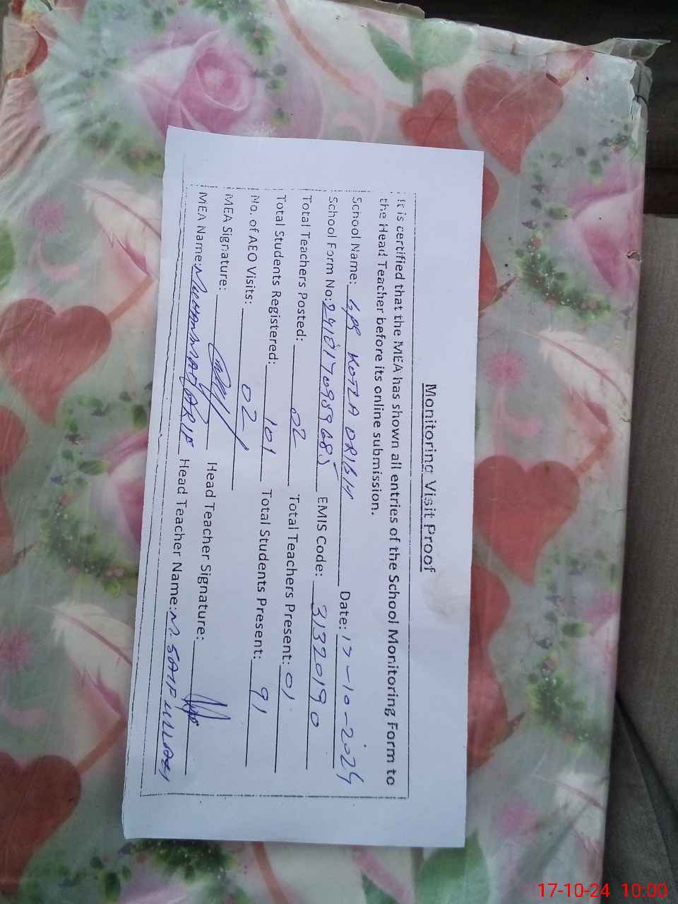 | Attendance Register | Head Teacher | MEA with School | Visit Proof |