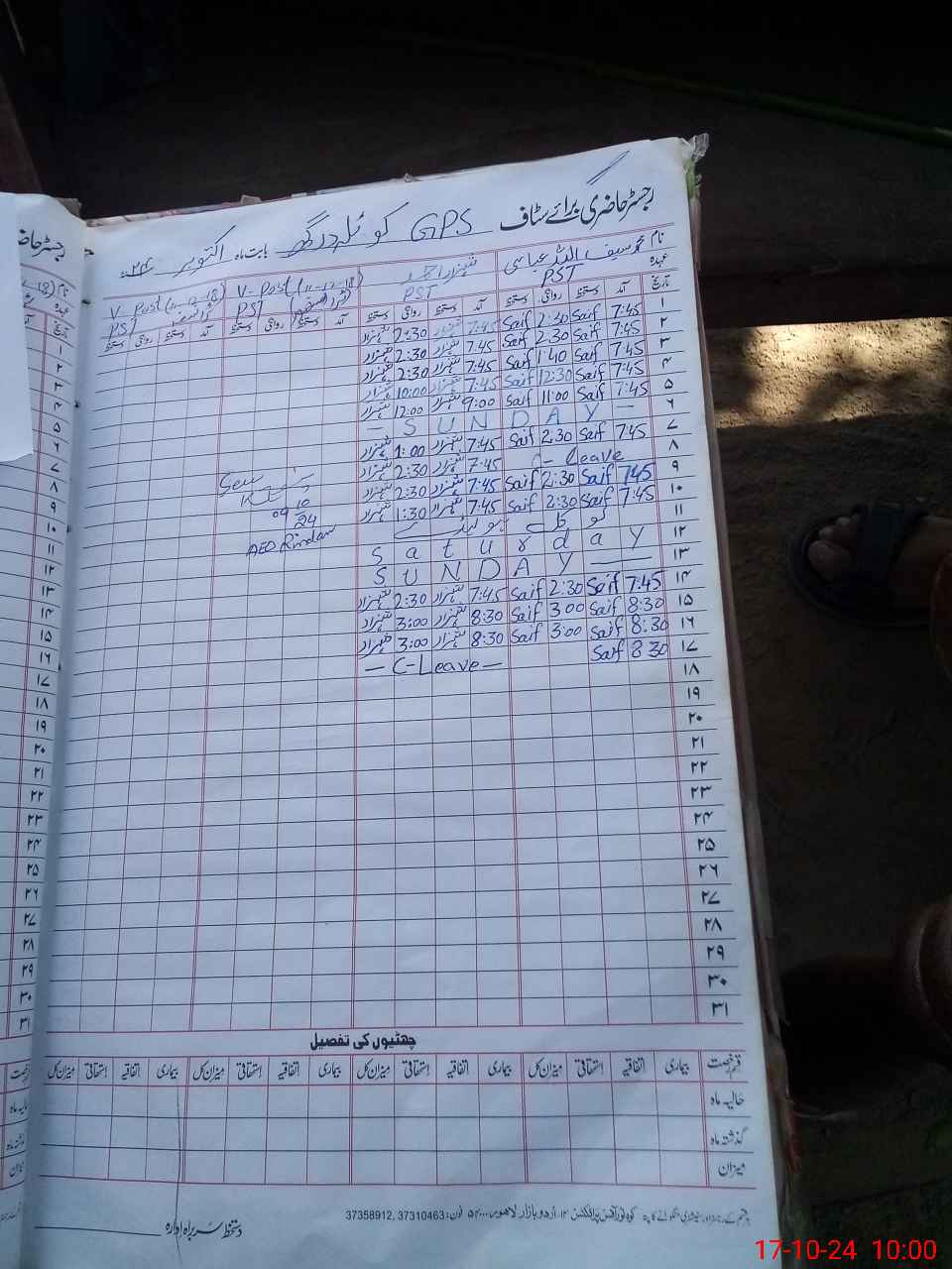 | CNIC | Full Name | Designation | R/C | Absence during last cal. month |