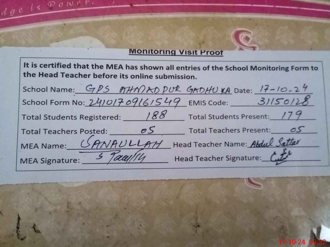 | EMIS Code: 31150128 | Name of School: GPS AHMAD PUR GADHUKA | |||