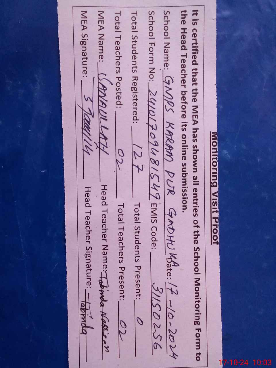 | EMIS Code: 31150256 | Name of School: GMPS KARAM PUR GADHOKA | |||