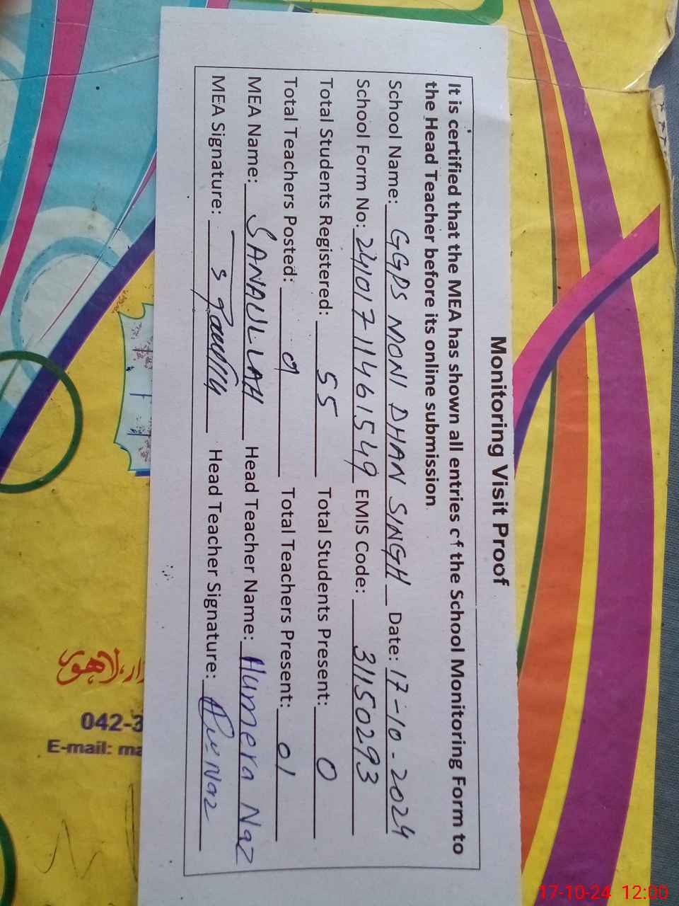 | EMIS Code: 31150293 | Name of School: GGPS MONI DAN SINGH | |||