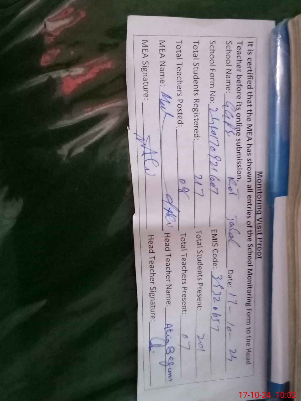 | Attendance Register | Head Teacher | MEA with School | Visit Proof |