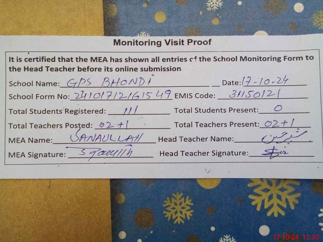 | Attendance Register | Head Teacher | MEA with School | Visit Proof |