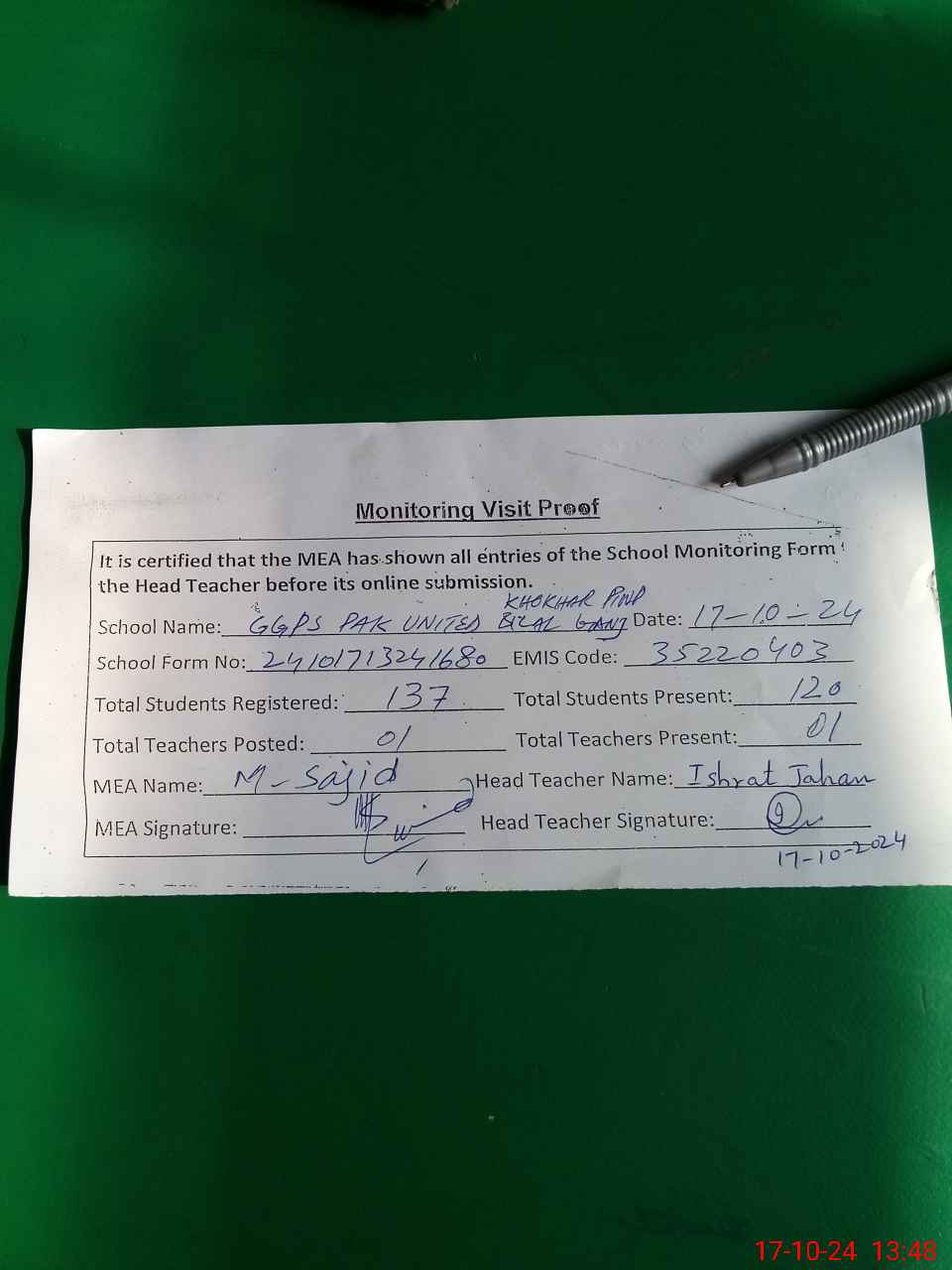 | EMIS Code: 35220403 | Name of School: GGPS PAK UNITED BILAL GUNJ (Working in Khokhar Pind) | |||