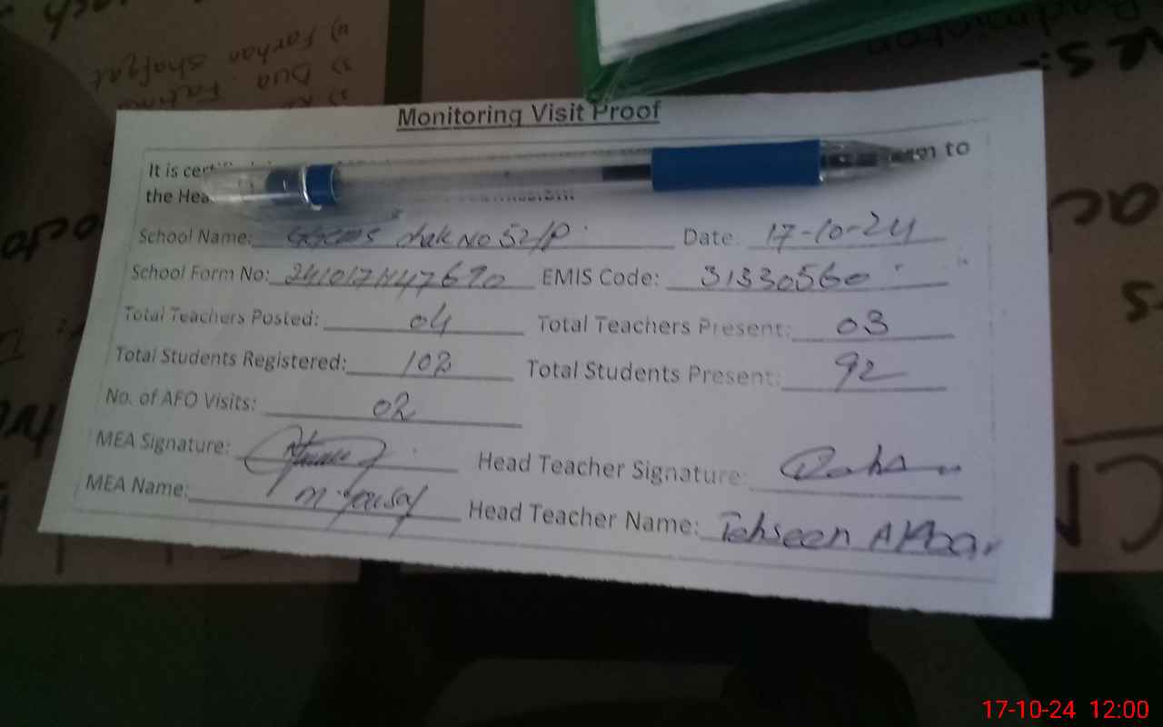 | Attendance Register | Head Teacher | MEA with School | Visit Proof |