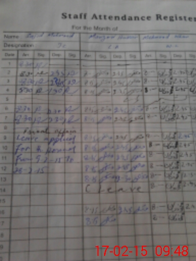 | CNIC | Full Name | Designation | R/C | Absence During Last Calender Month |