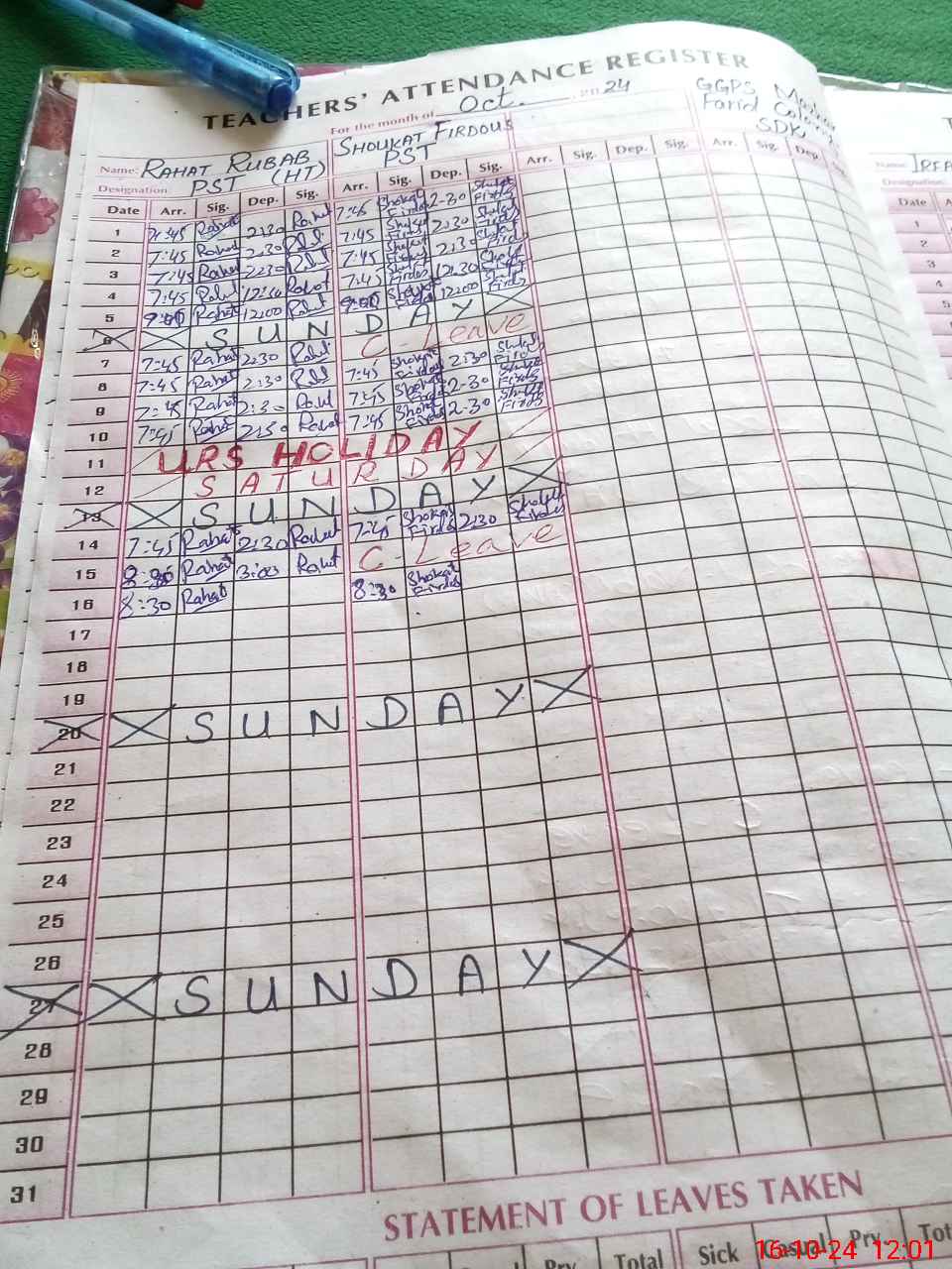 | Leave | Duty | Absent | Maternity | Medical | Ex- Pak |