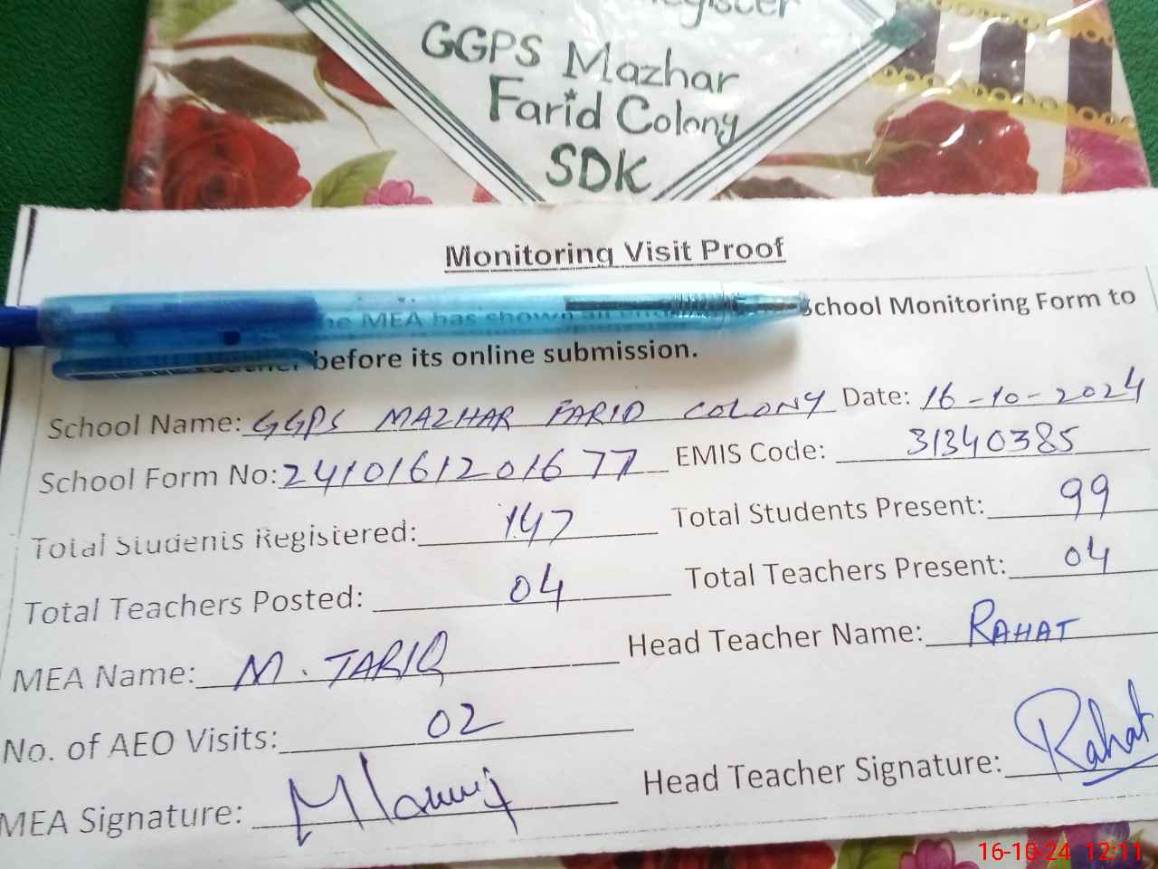 | Attendance Register | Head Teacher | MEA with School | Visit Proof |