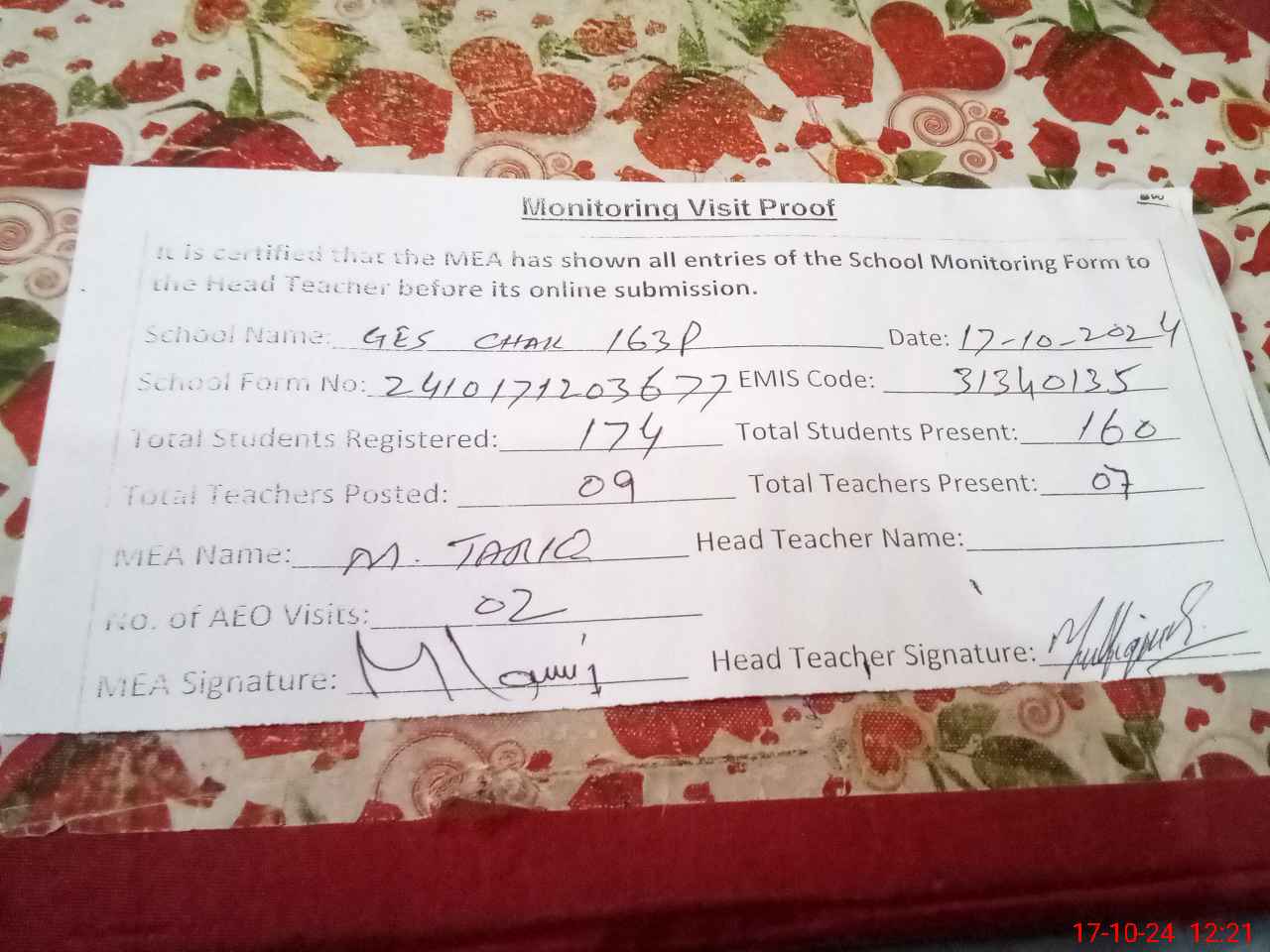 | Attendance Register | Head Teacher | MEA with School | Visit Proof |