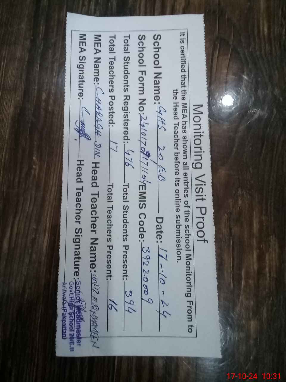 | EMIS Code: 39220009 | Name of School: GHS CHAK NO. 20/EB ARIFWALA | |||