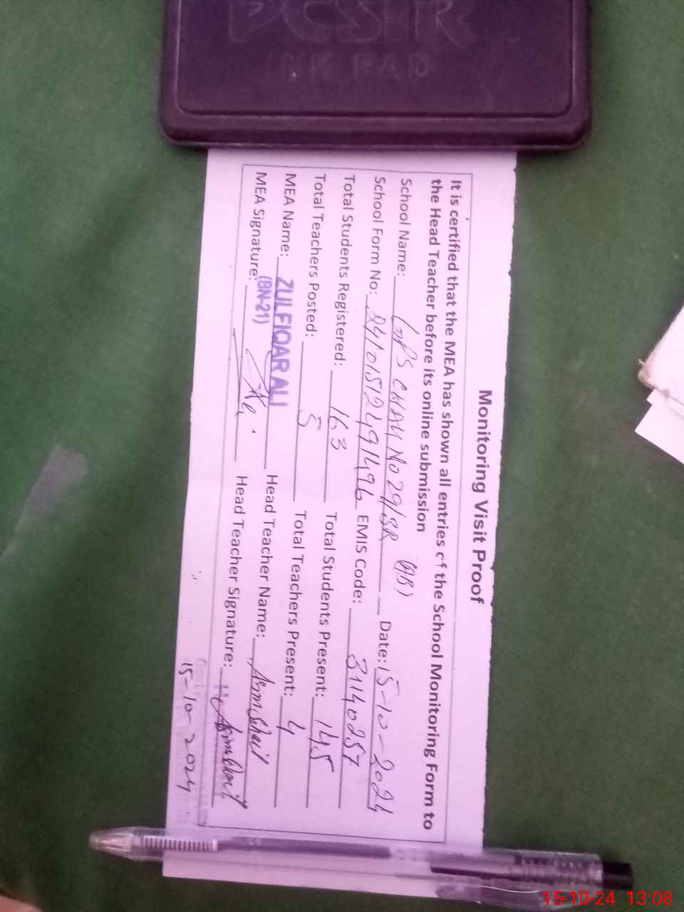 | Certified that this School was Inspected by the Undersigned MEA/DMO Today and the Information Stated Above is as Per Record. | |||||