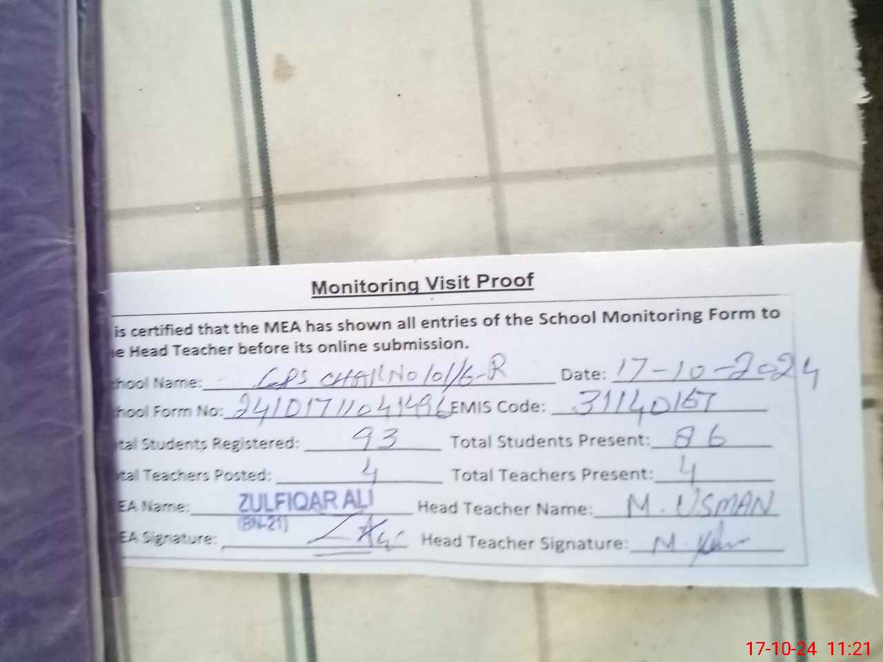 | Attendance Register | Head Teacher | MEA with School | Visit Proof |