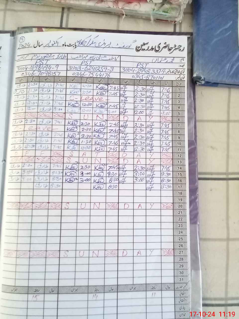 | CNIC | Full Name | Designation | R/C | Absence during last cal. month |