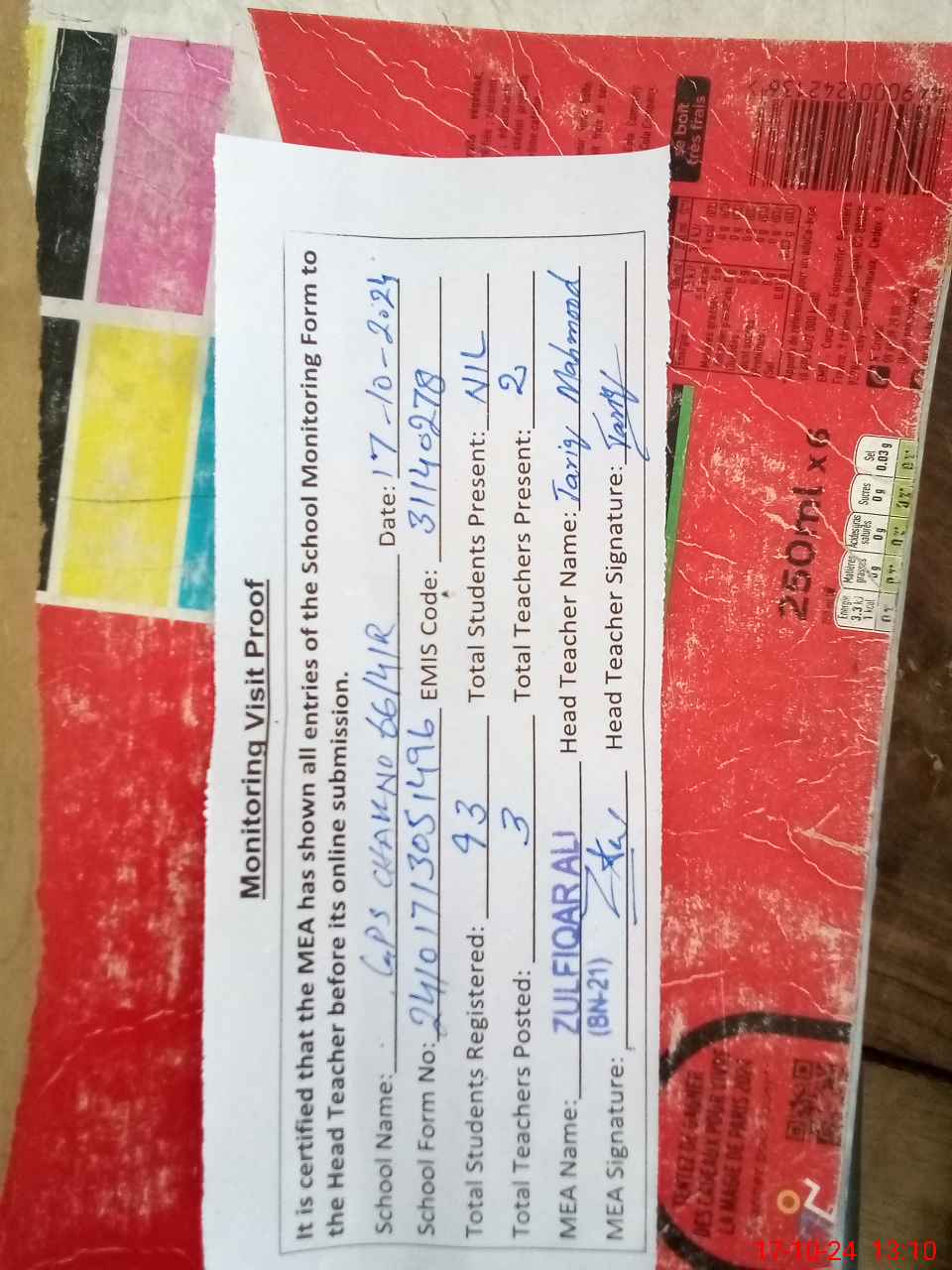 | Attendance Register | Head Teacher | MEA with School | Visit Proof |