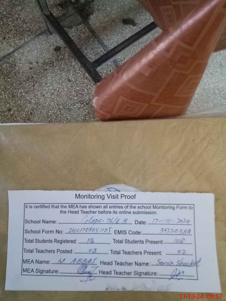 | Attendance Register | Head Teacher | MEA with School | Visit Proof |