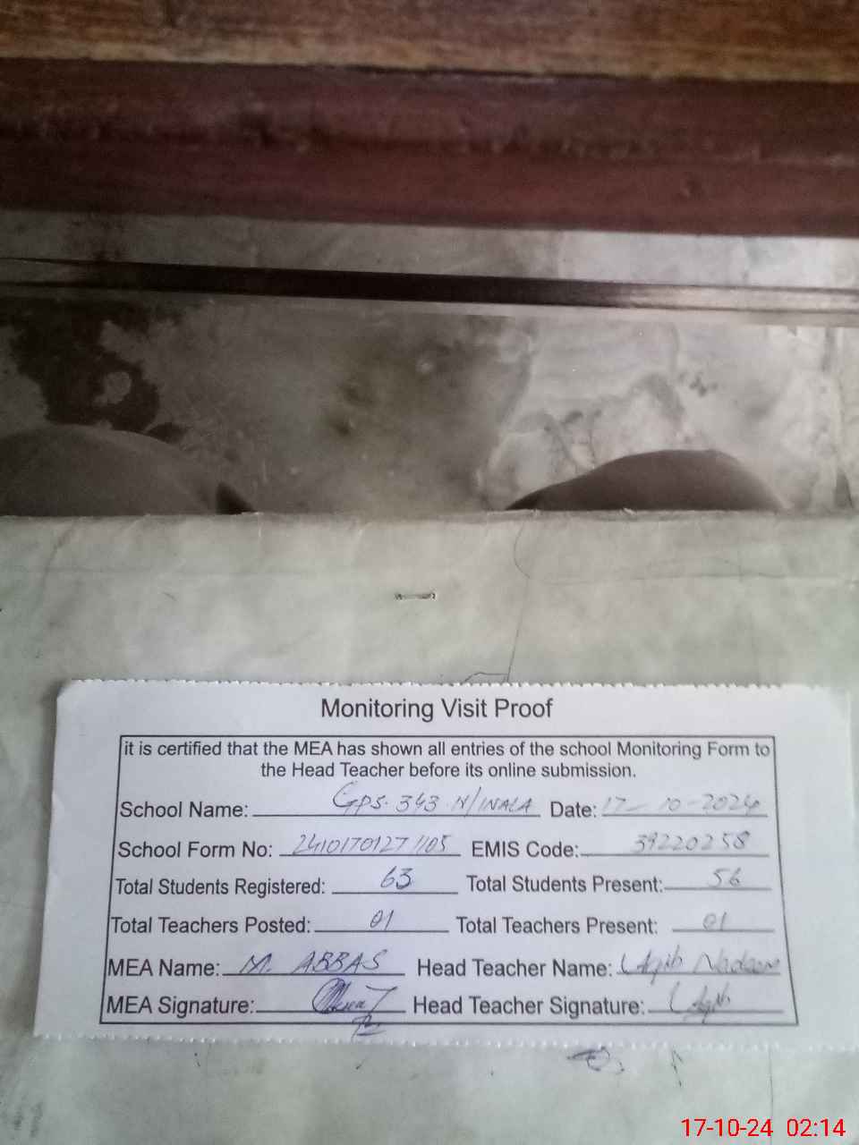 | Attendance Register | Head Teacher | MEA with School | Visit Proof |