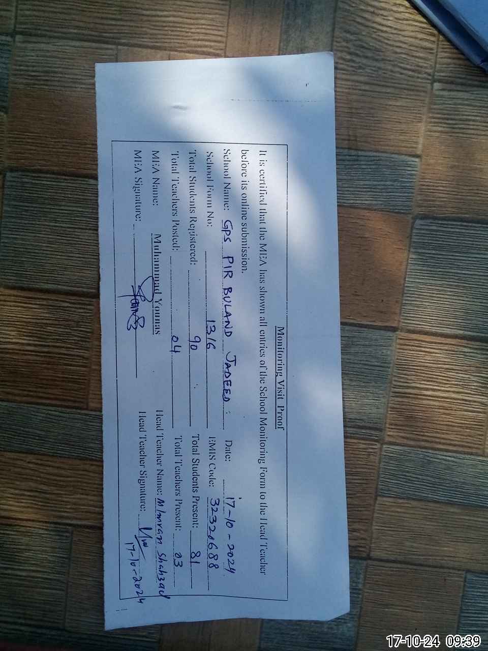 | EMIS Code: 32320688 | Name of School: GPS PIR BULAND JADEED | |||