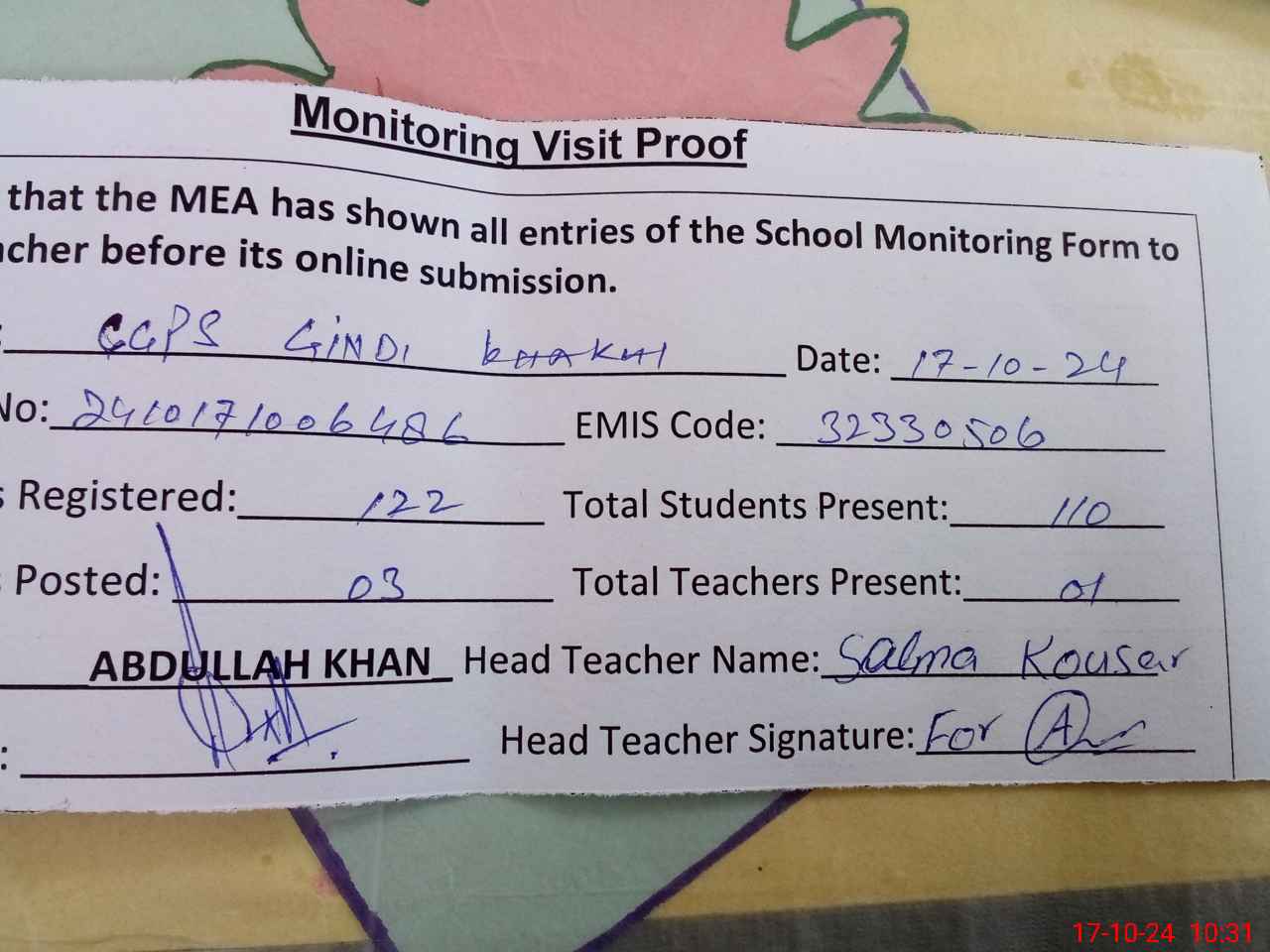 | EMIS Code: 32330506 | Name of School: GGPS GINDI KHAKHI | |||