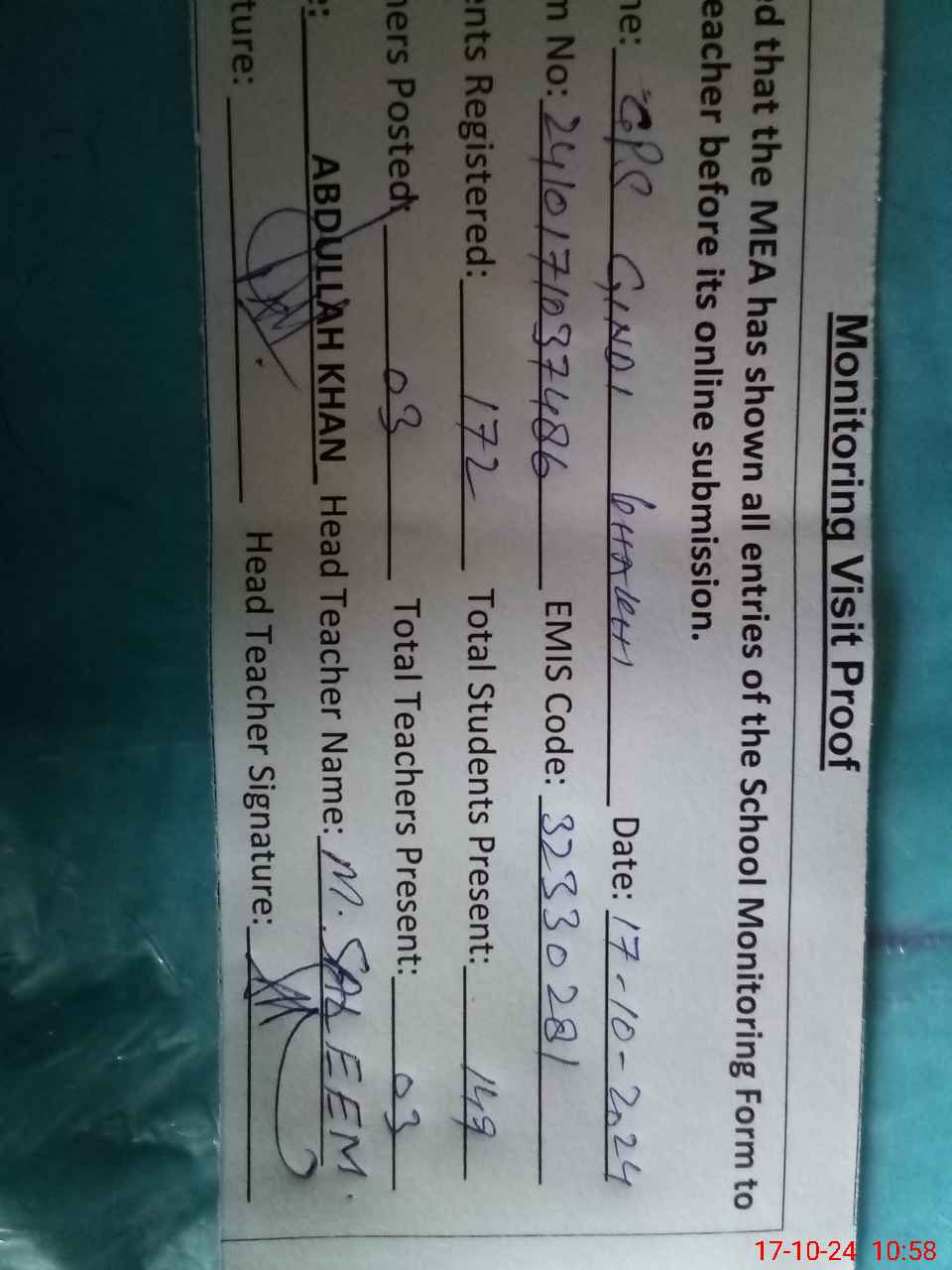 | Attendance Register | Head Teacher | MEA with School | Visit Proof |